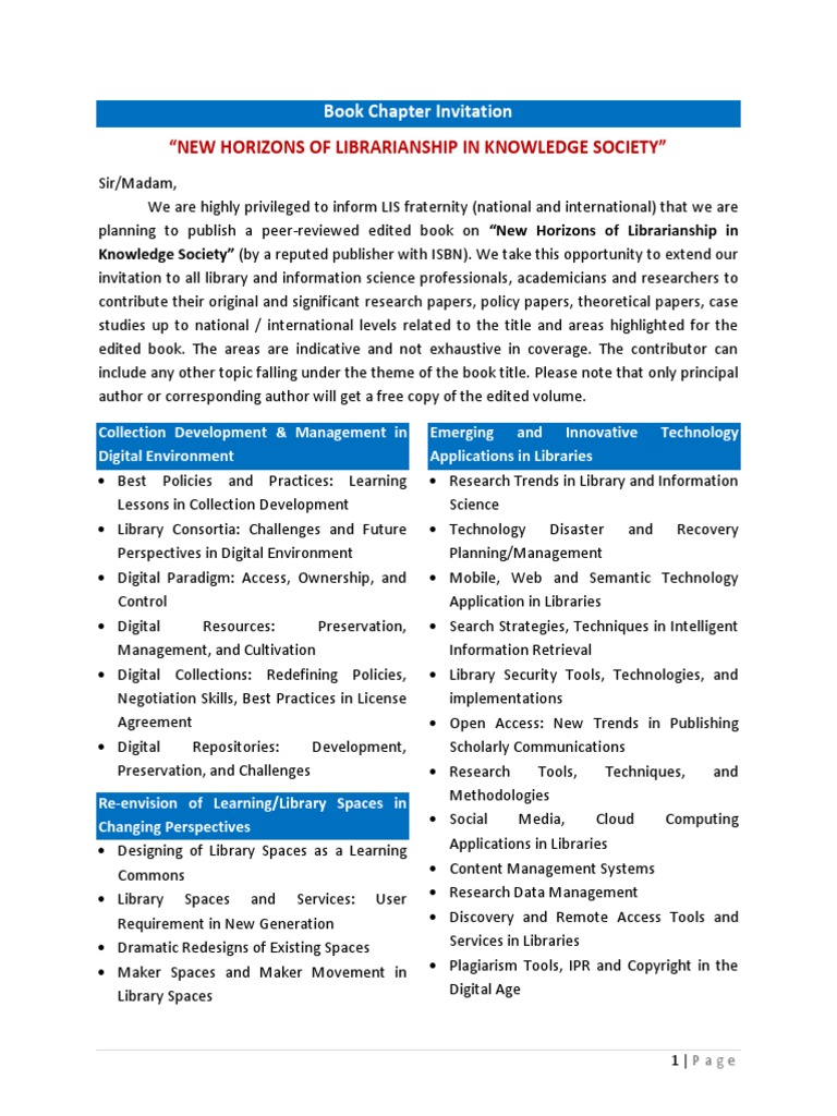 Book Chapter Invitation 2025 , Book Chapter Invitation 2025. This speaks a lot about springer. The edited volume will be published in the last quarter of 2025. The call for proposals for book chapter in upcoming springer eai series on iot and wsn. Separate crossref doi will be allotted to each. Search For Current Calls For Papers In Your Subject Area. Revision of paper (if required) : Enabling Indigenous Knowledge Systems (Iks) In Action Research (Ar) And Action Learning (Al) Is. The icati 2025 participants can submit book chapters to the books titled current studies in basic sciences, engineering and technology 2025 published annually by isres. Selected Papers Of The Conference Will Be Invited To Publish Their Papers As A Book Chapter With A Renowned Publishing Partner Of The Conference: Images References : We Are Inviting Original (Unpublished) Research Contributions For The Book Next Generation Systems And Secure Computing ”. Selected papers of the conference will be invited to publish their papers as a book chapter with a renowned publishing partner of the conference: The Icati 2025 Participants Can Submit Book Chapters To The Books Titled Current Studies In Basic Sciences, Engineering And Technology 2025 Published Annually By Isres. Below you will find the call for book chapter proposals that will be open until june 14, 2025. After Peer Review, All Accepted And Presented Papers Of Icwroee 2025 Will Be Submitted For Scopus Indexed Springer Book Chapter Volume. 2025